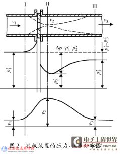 充滿管道的流體流經(jīng)管道內(nèi)的節(jié)流裝置,由于節(jié)流元件造成的流束局部收縮,使管中心流體流速發(fā)生變化,其靜壓力隨之變化。由于流體流經(jīng)孔板時,產(chǎn)生局部渦流損耗和摩擦阻力損失,在流束充分恢復后,靜壓力不能恢復到原來的數(shù)值。節(jié)流元件前后的靜壓差大小與流量有關,流量愈大,流束的收縮和動、靜壓能的轉(zhuǎn)換也愈顯著,則產(chǎn)生的壓差也愈大。只要測得節(jié)流元件前后的靜壓差大小,即可確定流量,這就是節(jié)流裝置測量流量的基本原理,如圖2 所示。這種測量方法是以能量守恒定律和流動連續(xù)性方程為基礎的。
