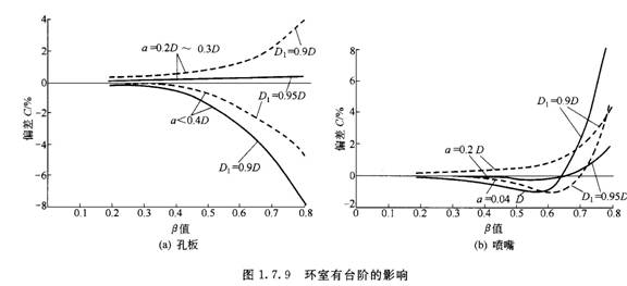 環室內徑小于管道內徑,如圖1.7.8所示,將產生大的測量誤差。圖1.7.9所示為環室產生臺階時流出系數的偏差影響。