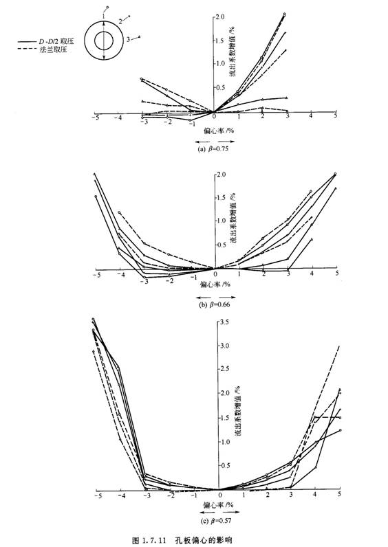 圖1.7.10所示為節流開孔軸線與法蘭內圓軸線及管道軸線之間的偏心圖形。偏心率對流出系數的影響與B值、取壓方式、偏心方向等有關,如圖1.7.11所示。 自