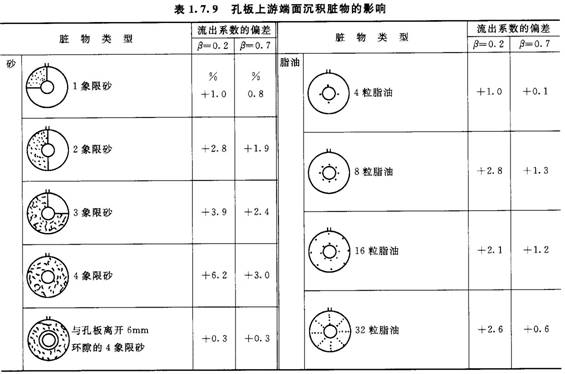 表1.7.9所示為孔板上游端面沉積臟物對流出系數的影響。砂粒顆粒尺寸為O.4mm,脂油污點的直徑為6.3mm,厚為2.5mm,孔板裝于DN100測量管內,測量大氣壓下的空氣。由圖可見,孔板入口處環狀區域的情況很重要,它對測量誤差的影響起主要作用。