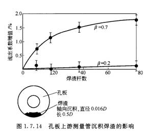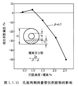 圖1.7.14和圖1.7.15所示為孔板上游側測量管底部沉積臟物對流出系數的影響。