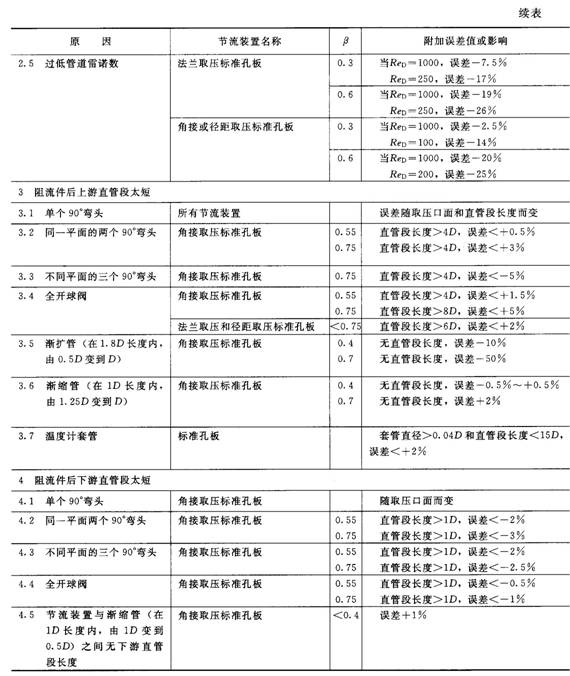 當節流件上游側直管段長度不符標準規定時,流出系數將發生變化。表1.7.6及表1.7.7列舉若干流出系數偏差的估算值及其附加不確定度。
