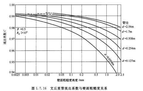 文丘里管內壁沉積臟物起二重作用:減少通道截面積和增加表面粗糙度。兩種影響綜合起來使流出系數降低,如圖1.7.16所示。