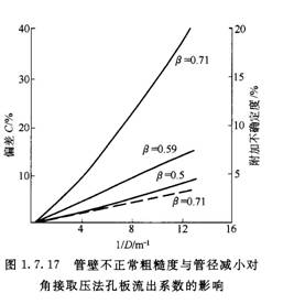1.角接取壓標準孔板在糙管中流出系數的變化圖1.7.17和圖1.7.18所示為角接取壓標準孔板在糙管中流出系數的變化。圖1.7.17所示管壁條件為:管壁結垢為球形瘤,平均尺寸為6.3mm,亦就是管道內徑有效值減少約6.3mm。 因中虛線B=0.71是經砂磨表面,顆粒約O.5~1.Omm。圖1.7.18所示的管壁條件顆粒尺寸約1mm多,即約為圖1.7.17所示的1/3。