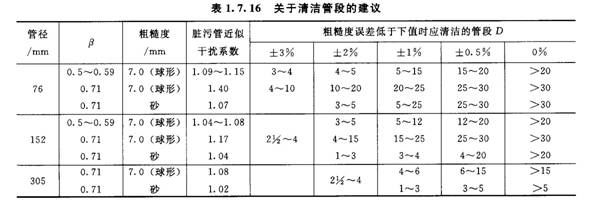 表1.7.16所示為管壁清除臟物(結垢),使粗糙度降低后改善流出系數測量誤差的情況。由表可見,在節流件上游側附近一段管道清除污物可以顯著提高流出系數的測量精度。對于大口徑管道(DN>300),清洗的管段可以顯著縮短。