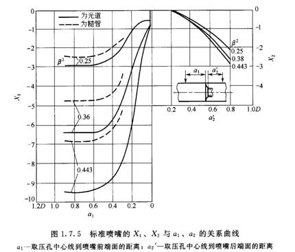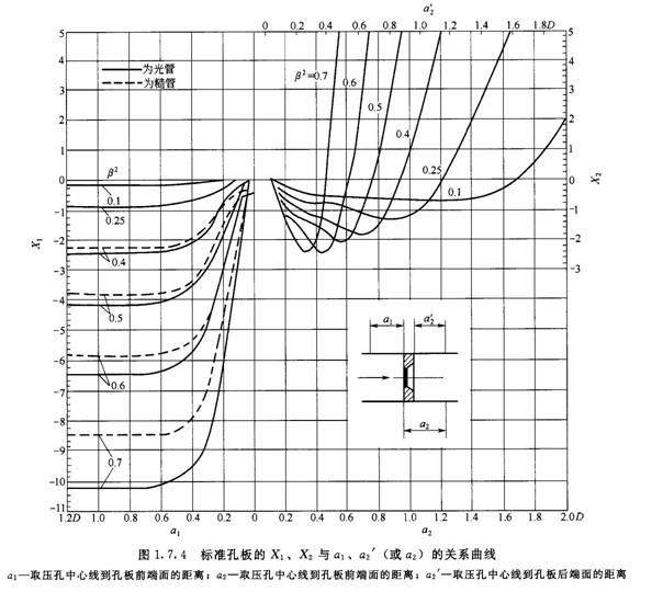 式中Xl和X2與al和a2'(a2)有關。角接取壓標準孔板和標準噴嘴的Xl和X2值是不同的,如圖1.7.4和圖1.7.5所示。