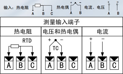 熱電阻:Pt100/Cu100/Cu50/BA1/BA2/G53;引線電阻補(bǔ)償范圍≤50Ω,熱電阻接線時A/B/C三個端子必須都要接上,B/C端子可以短接,C端子數(shù)目不夠時,通道可以共用,接線如上圖所示。
