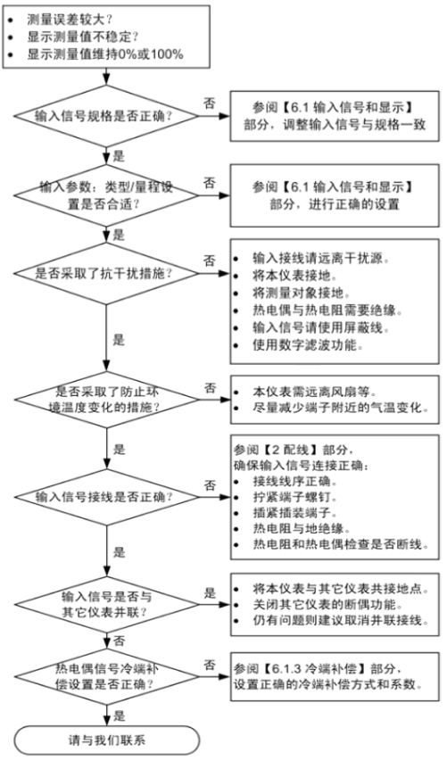 6.故障現(xiàn)象:接好電源以及信號后儀表顯示不是正常數(shù)值,顯示O.L/-O.L或者其他數(shù)值,輸入信號進(jìn)入后顯示值不變化。