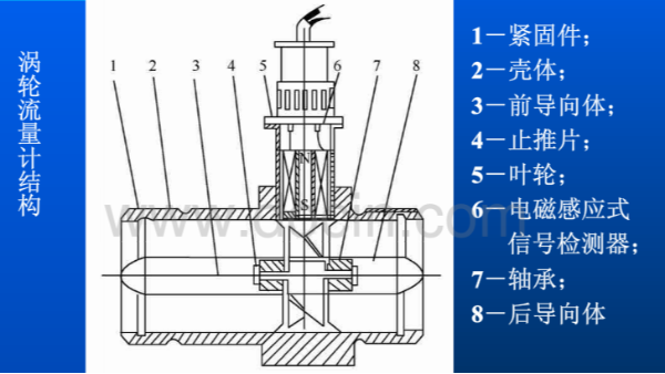 渦輪流量計(jì)是一種速度式流量計(jì)。如下圖所示,在管道中心安放一個渦輪,兩端由軸承支撐,當(dāng)流體通過管道時,沖擊渦輪葉片,對渦輪產(chǎn)生驅(qū)動力矩,使渦輪克服摩擦力矩和流體阻力矩而產(chǎn)生旋轉(zhuǎn).在一定的流量范圍內(nèi),對一定的流體介質(zhì)粘度,渦輪的旋轉(zhuǎn)角速度與流體流速成正比.由此,流體流速可通過渦輪的旋轉(zhuǎn)角速度得到,從而可以計(jì)算得到通過管道的流體流量。
